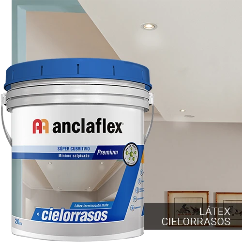 Anclaflex Cielorrasos es un látex de terminación mate formulado a base de polímeros acrílicos en dispersión acuosa. Su fórmula especial brinda una película firme, pero de alta porosidad. Buen poder cubritivo y blancura. De fácil aplicación y rápido secado. Resuelve los problemas de condensación y salpicado a la hora de pintar. Sus aditivos de alta efectividad le confieren una gran resistencia a los hongos.